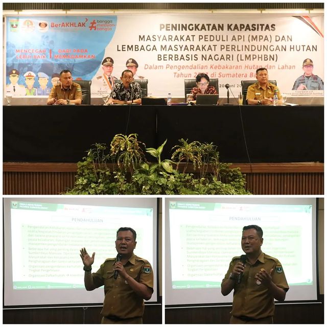 Dalam rangka Peningkatan Kapasitas Masyarakat Peduli Api (MPA) dan Lembaga Masyarakat Perlindungan Hutan Berbasis Nagari (LMPHBN) dalam Pengendalian Kebakaran Hutan dan Lahan Tahun 2023 di Provinsi Sumatera Barat 19-20 Juni 2023 di Pangeran Beach Hotel, peserta diberikan materi terkait: