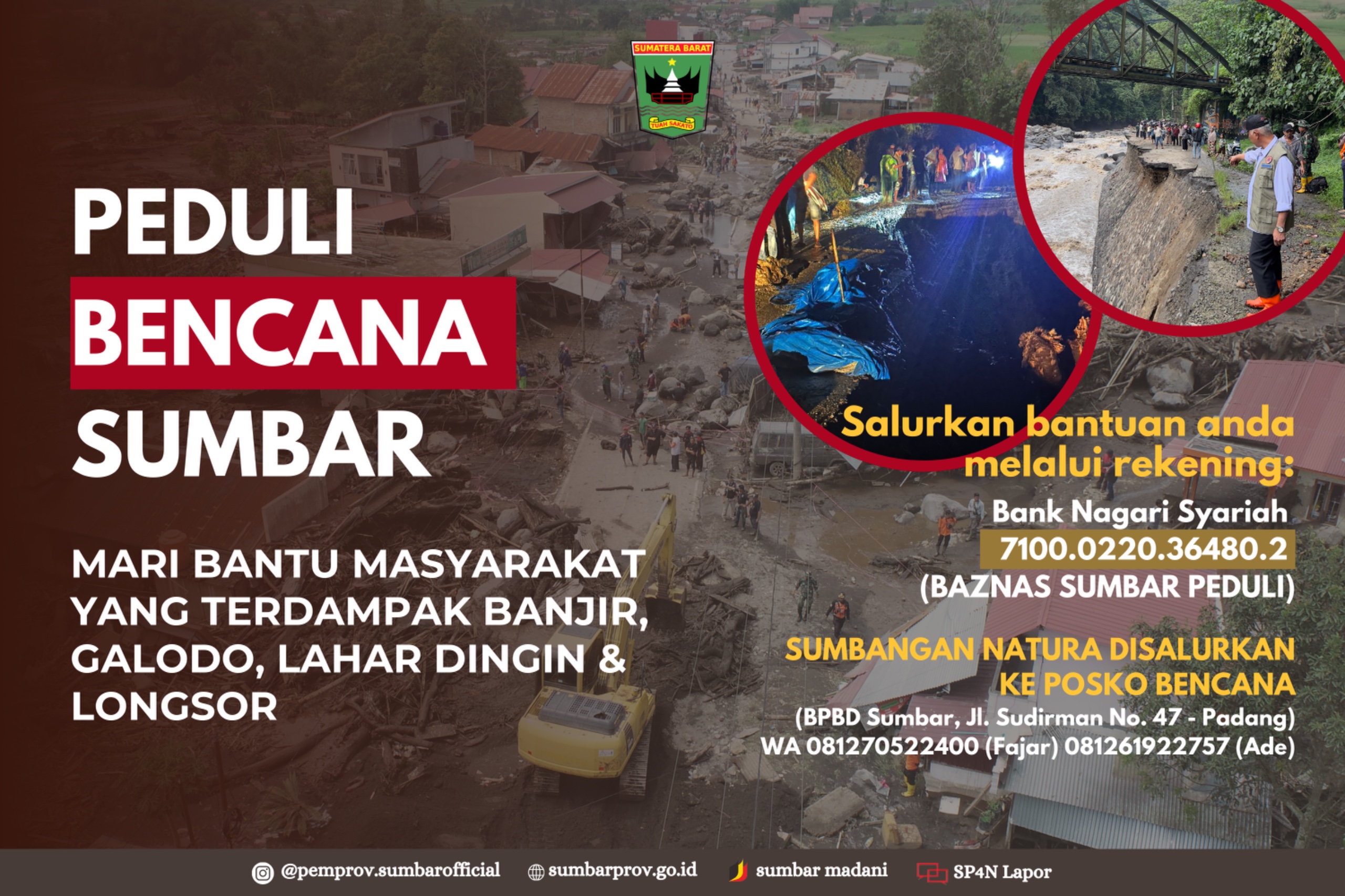 Dalam rangka membantu meringankan beban Saudara-Saudara kita yang tertimpa bencana banjir, galodo, lahar dingin dan longsor. Pemerintah Provinsi Sumatera Barat bekerjasama dengan Baznas siap menerima bantuan dari kita semua melalui program "Peduli Bencana Sumbar"
