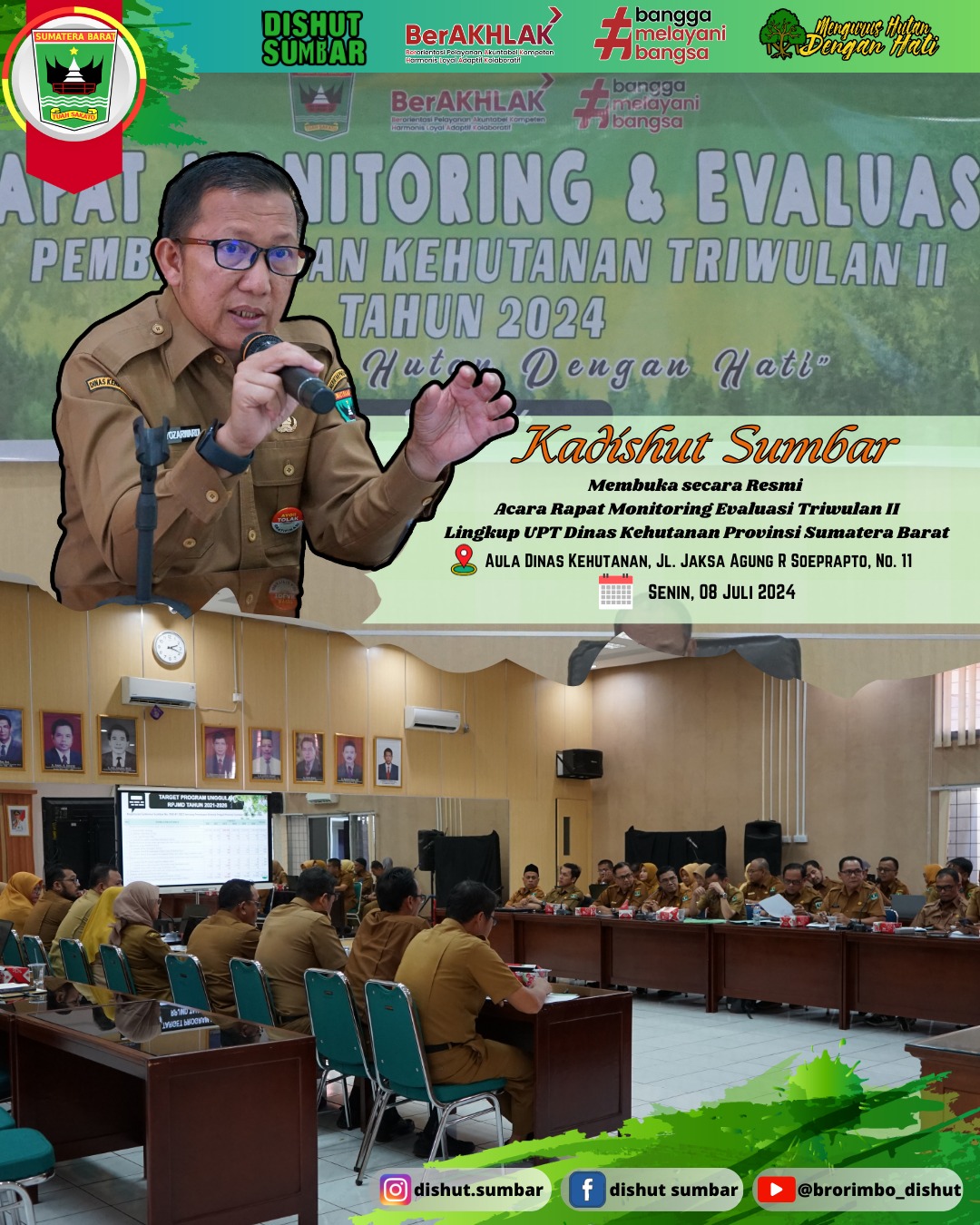 Dinas kehutanan Provinsi Sumatera Barat melaksanakan Rapat Monev TW II pada Tanggal 8 Juli 2024 di Aula Dinas Kehutanan. Pada kesempatan ini Kepala Dinas menyampaikan Capaian Indikator Kinerja Utama, Indikator Kinerja Daerah, Indikator Kinerja Progul sampai dengan TW II. Kepala Dinas juga meminta semua Kepala Unit Lingkup Dinas Kehutanan untuk menindaklajuti Laporan Hasil Evaluasi (LHE) Atas Akuntabilitas Kinerja Instansi Pemerintah pada Dinas Kehutanan Provinsi Sumatera Barat Tahun 2024 Nomor 700/06/LHE/INSP/2024 tanggal 20 Juni 2024 pada semua komponen Perencanaan, Pengukuran Kinerja, Pelaporan Kinerja dan Evaluasi Akuntabilitas Kinerja Internal