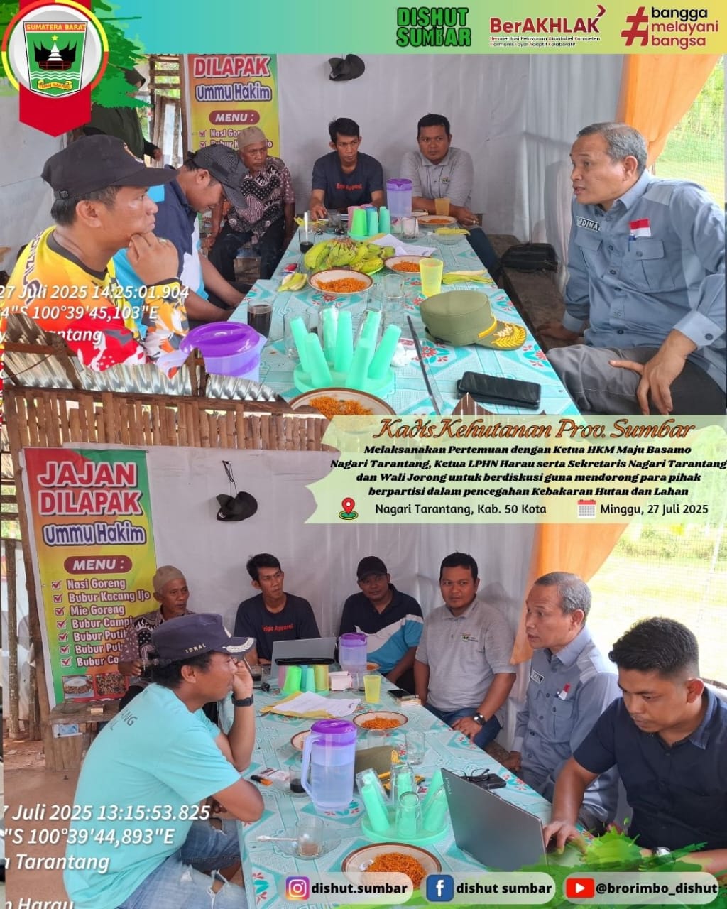 Pertemuan Kepala Dinas Kehutanan Provinsi Sumatera Barat @ferdinaasmin dengan Ketua HKm Maju Basamo Nagari Tarantang bersama anggota dan LPHN Harau serta Sekretaris Nagari Tarantang dan Wali Jorong, mendorong peran para pihak untuk partisipasi terhadap Pencegahan dan Penanganan Bencana Kebakaran di wilayah masing-masing. Diharapkan dengan kebersamaan, kejadian Kebakaran Hutan dan Lahan dapat diatasi secara cepat dan terpadu di tingkat nagari.