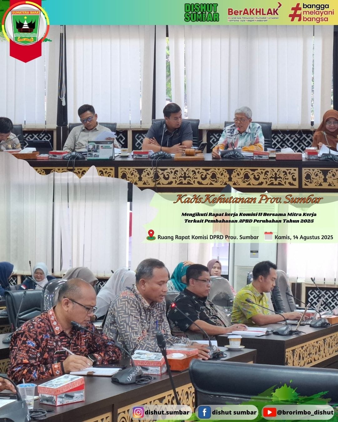 Kepala Dinas Kehutanan Provinsi Sumatera Barat @ferdinalasmin didampingi oleh Sekretaris Dinas, Kabid PPMHA, Kabid PDAS RHL, Kabid PHKSDAE, Kepala UPTD BSPTH dan Kepala UPTD KPHP Mentawai mengikuti Rapat Kerja Komisi II Bersama Mitra Kerja Terkait Pembahasan APBD Perubahan Tahun 2025 di Ruang Rapat Komisi II DPRD Provinsi Sumatera Barat pada Kamis, 14 Agustus 2025.