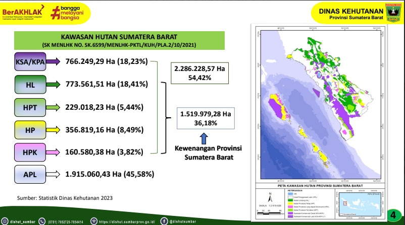Sumatera Barat memiliki kawasan hutan yang bermanfaat dan berfungsi untuk memenuhi kebutuhan sosial, ekonomi, dan ekologi bagi masyarakatnya. Memperhatikan data BPS Sumbar (2025), sekitar 2,3 juta ha atau 54 % dari luas wilayah Sumatera Barat merupakan kawasan hutan, dan sekitar 46% dari kawasan hutan tersebut masih bervegetasi hutan, terutama hutan primer, hutan sekunder, dan hutan tanaman. Hutan Sumatera Barat merupakan salah satu ekosistem alam yang penting di Pulau Sumatera.