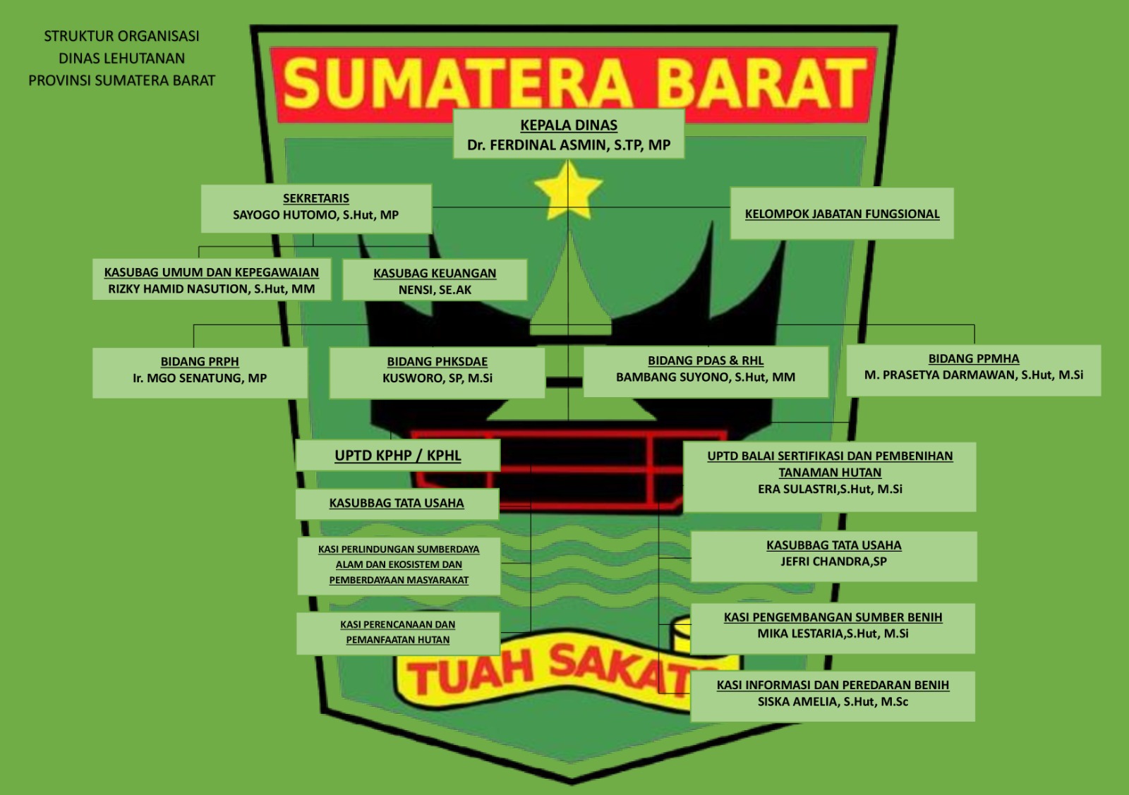 Dinas Kehutanan Provinsi Sumatera Barat memiliki struktur organisasi mulai dari Kepala Dinas, Sekretaris, Kepala Bidang, Kepala UPTD, sampai dengan Kepala Sub Bagian. Jumlah UPTD di lingkungan Dinas Kehutanan Provinsi Sumatera Barat adalah sebanyak dua belas UPTD yang terdiri dari KPHL dan KPHP.