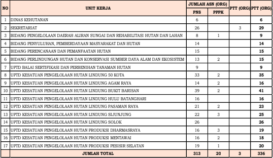 Penyelenggaraan fungsi dan tugas pokok Dinas Kehutanan Provinsi Sumatera Barat didukung oleh sumber daya manusia sebanyak 336 orang dengan status kepegawaian 333 orang Aparatur Sipil Negara (ASN) yang terdiri dari 313 orang Pegawai Negeri Sipil (PNS) dan 20 Orang Pegawai Pemerintah dengan Perjanjian Kerja (PPPK) dan 3 orang Pegawai Tidak Tetap (PTT).