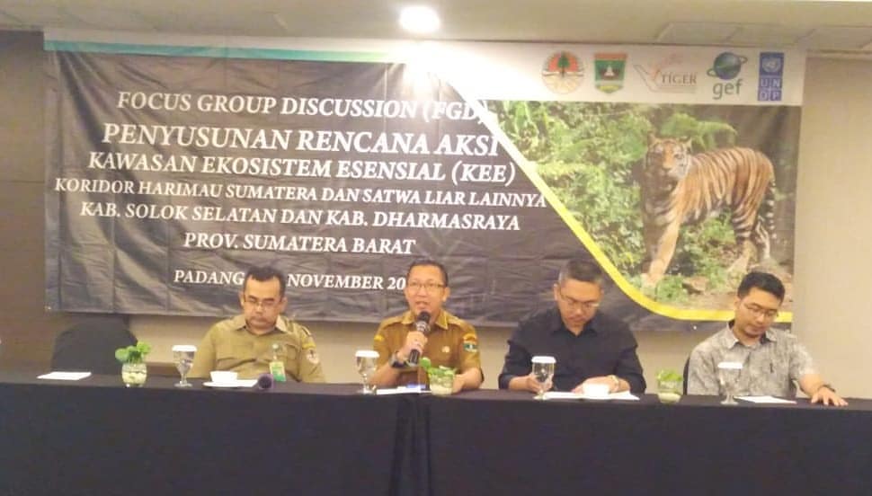 Padang, 5 November 2019 “Penyusunan Renaksi Kawasan Ekosistem Esensial Koridor Harimau Sumatera dan Satwa Liar lainnya” Kepala Dinas Kehutanan Provinsi Sumatera Barat berkesempatan membuka acara Focus Group Discussion Penyusunan Renaksi Kawasan Ekosistem Esensial Koridor Harimau Sumatera dan Satwa Liar lainnya yang diselenggarakan pada tanggal 4-5 November 2019 di Hotel Mercure Padang. Acara tersebut diinisiasi oleh DIrektorat Pengelolaan Ekosistem Esensial, Kementerian Lingkungan Hidup dan Kehutanan bekerjasama dengan Sumatran Tiger Project serta Dinas Kehutanan Provinsi Sumatera Barat yang dihadiri oleh semua anggota forum kolaborasi. Dalam sambutannya Yozarwardi UP menyampaikan beberapa hal terkait Konservasi harimau di Sumatera Barat. “Harimau sangat erat kaitannya dengan alam Minangkabau. Kita tentunya mengenal istilah Harimau Panti, Harimau Pasaman, Harimau Agam, Harimau Tambun Tulang bahkan sampai Harimau Pasisia. Penamaan tersebut menunjukkan lansekap Sumatera Barat mulai dari utara sampai selatan memiliki penamaan khusus untuk harimau mereka. Masyarakat setempat menyebutnya dengan “inyiak”, yang berarti seseorang yang dituakan, dihormati karena ilmu, rekam jejak serta kiprahnya. Pada beberapa daerah sampai sekarang bahkan masih menganggap harimau sebagai pelindung kampung atau ulayatnya. Narasi tersebut menunjukkan bahwa masyarakat Sumatera Barat mempunyai hubungan yang sangat erat dengan keberadaan Harimau Sumatera” Konservasi Harimau Sumatera di Provinsi Sumatera Barat sudah mengalami banyak perkembangan, dimana sejak tahun 2016 Dinas Kehutanan Provinsi Sumatera Barat bersama-sama dengan stakeholder lainnya telah melakukan upaya konservasi yaitu dengan membentuk Kawasan Ekosistem Esensial Koridor Harimau Sumatera dan Satwa Liar Lainnya di Kabupaten Solok Selatan dan Kabupaten Dharmasraya, yang konsorsium pengelolannya juga telah di SK-kan melalui Keputusan Gubernur Sumatera Barat Nomor 522.5/2867/ dishut-2018 tanggal 31 Juli 2018.